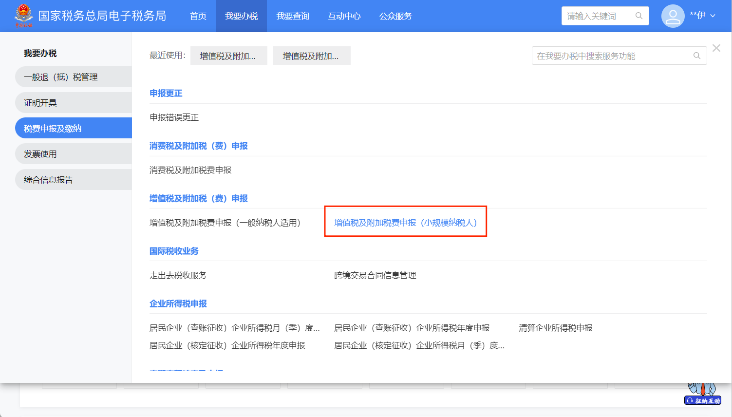 一、登录电子税务局后,点击【我要办税】-【税费申报及缴纳】-【增值税及附加税费申报(小规模纳税人)】功能菜单,如图1所示: