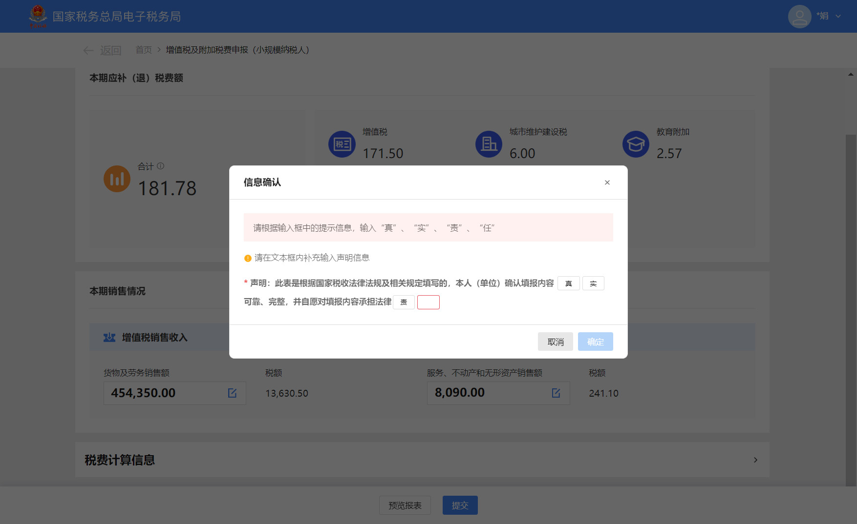 4.您填写完成,确认数据无误后,点击“提交”后,需要对本次申报结果进行确认声明,按提示补全声明信息后,点击【确认】即可提交申报,如图8所示: