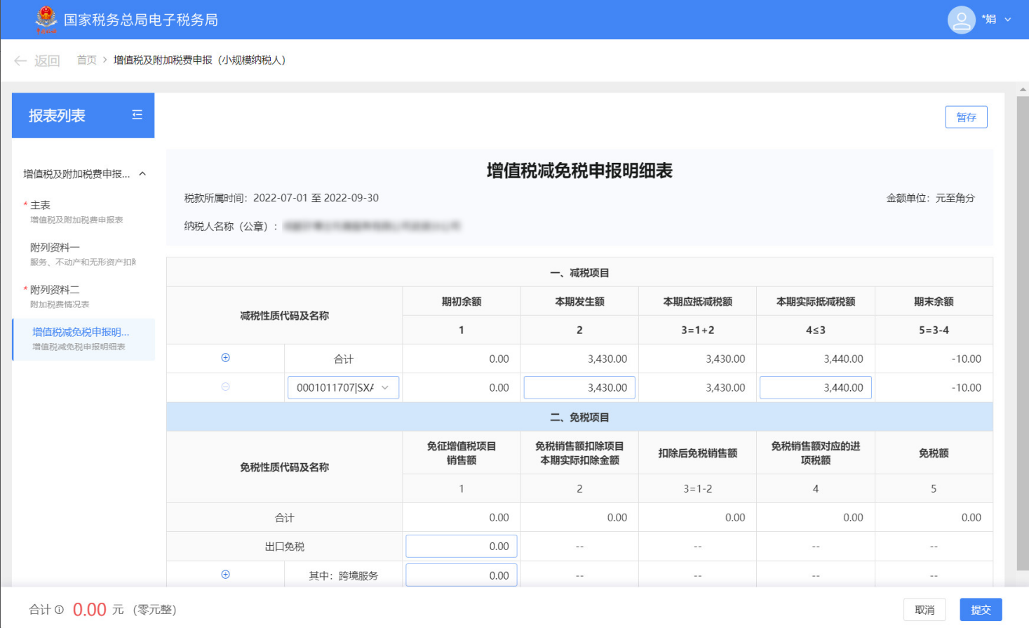 2.若需填写减免信息,则在“增值税减免税申报明细表”附表中选择减免性质代码及名称,并输入对应的减免税额信息,如图12所示: