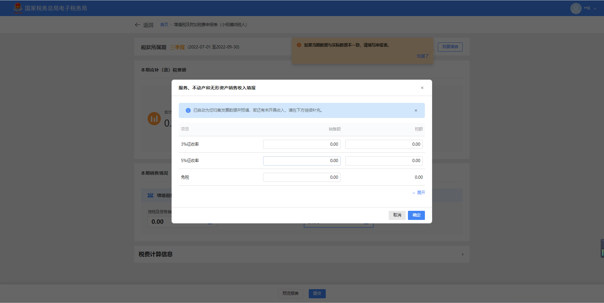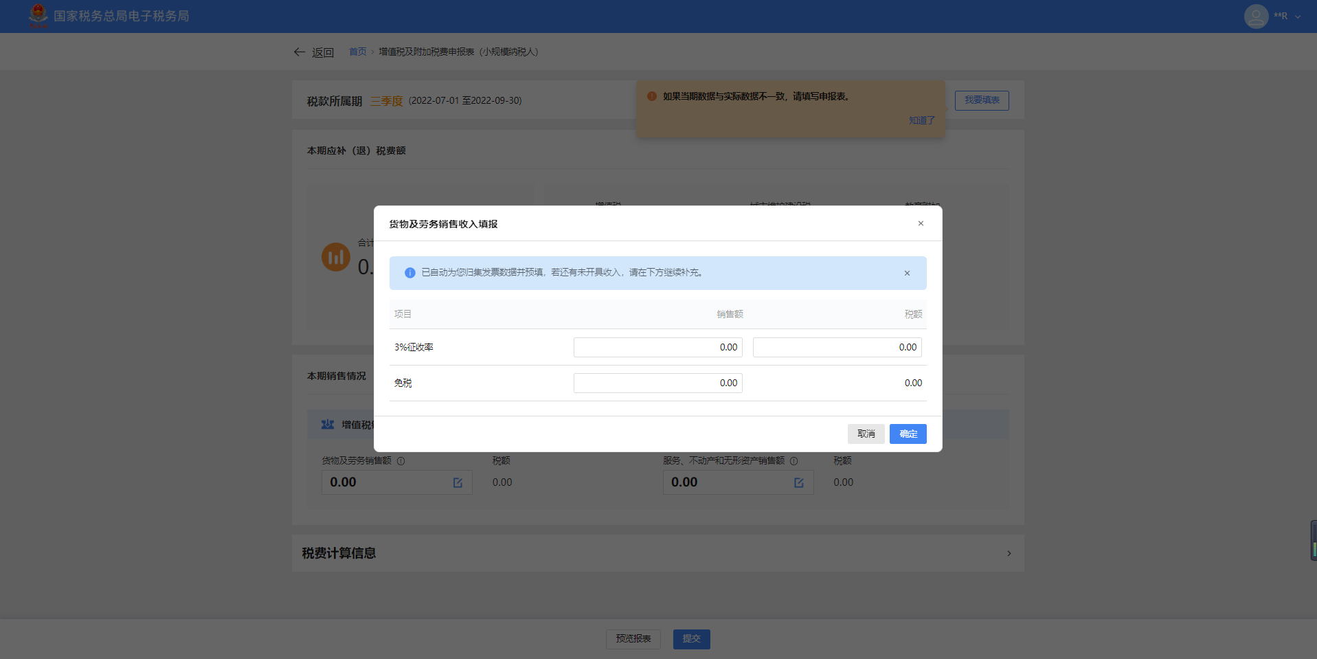 2.在确认式申报界面,您若当期有未开具发票收入,请点击增值税销售收入栏次下的输入框进行填写,若在确认式申报页面发现预填数据不准确,请点击“我要填表”进行修改。