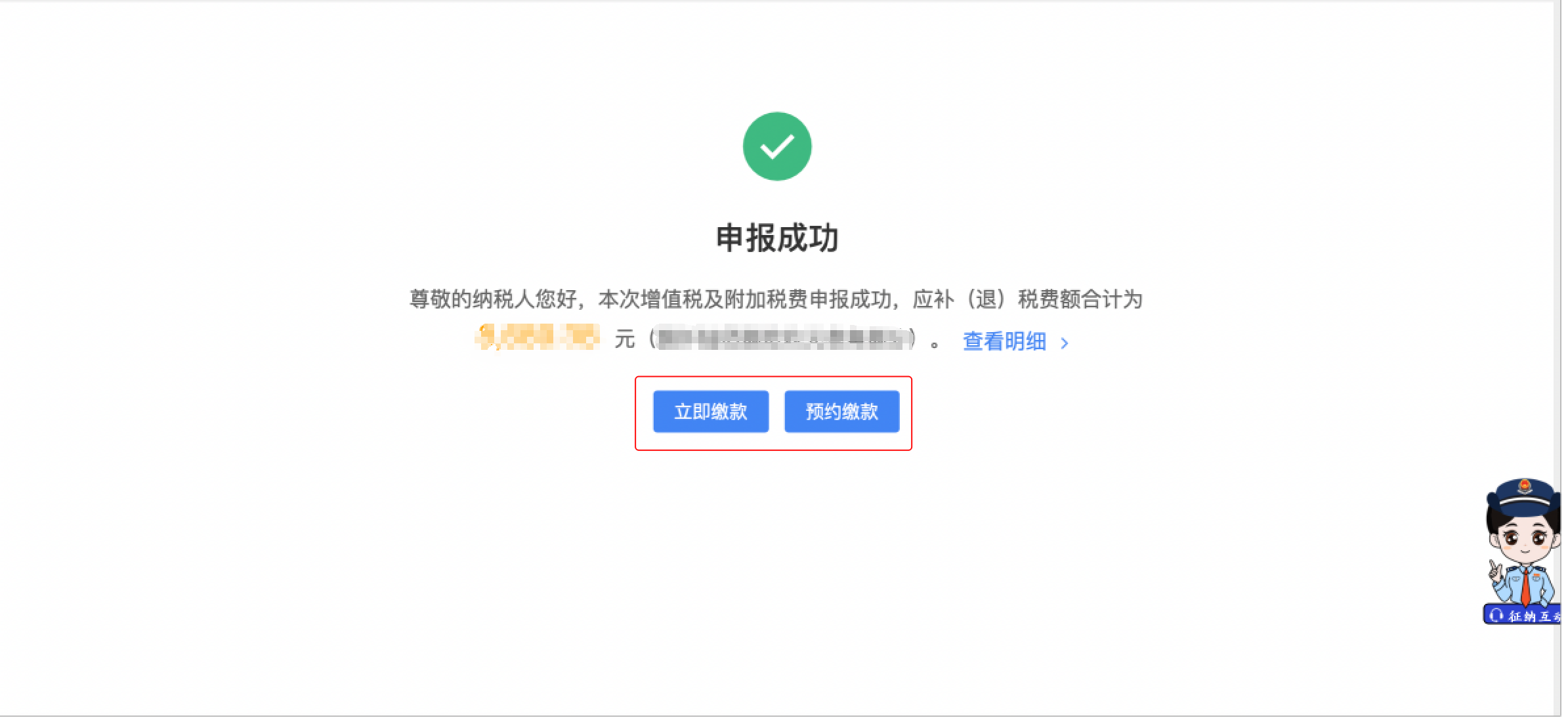 5.申报成功后,可以进行立即缴款,查验本期税款显示无误之后,可选择立即缴款或者预约缴款完成本次申报涉及的税费款缴纳,如图9所示: