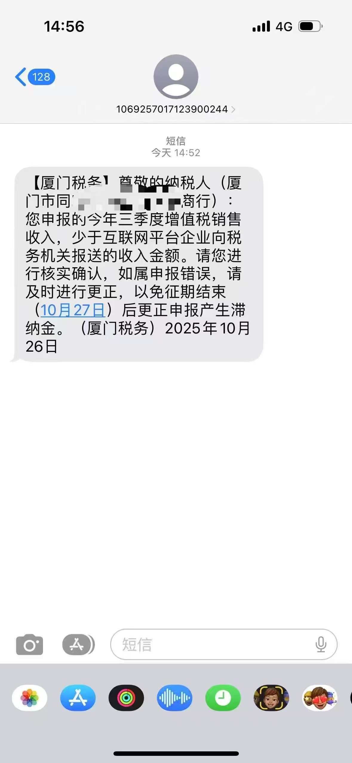 您申报的今年第三季度增值税销售收入,少于互联网平台企业向税务机关报税的收入金额。请您进行核实确认,如属申报错误,请及时进行更正,以免征期结束(10月27日)后更正申报产生滞纳金。(厦门税务)2025年10月26日。